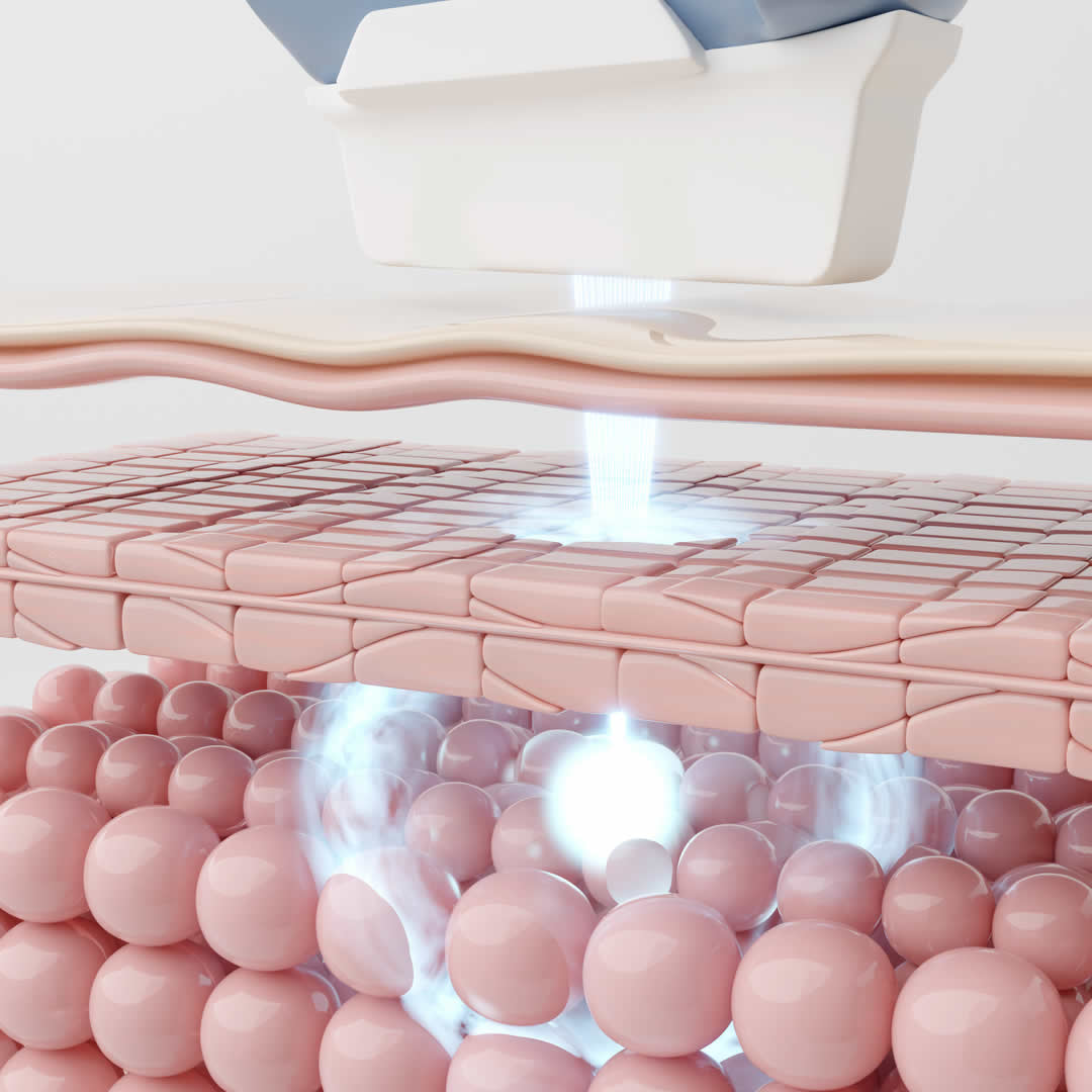 医療ハイフは「High Intensity Focused Ultrasound(高密度焦点式超音波)」の略で、超音波の熱エネルギーを一点に集中させ、皮膚の深い層へアプローチすることによって、肌のたるみを引き締める施術方法です。特に、顔の皮膚を支える「SMAS筋膜(表在性筋膜)」と呼ばれる層まで熱を届けられる点が、医療ハイフならではの特徴です。SMAS層は、加齢によるたるみの根本原因とされており、この層にアプローチすることで、外科的なフェイスリフトに近い引き上げ効果を目指すことができます。