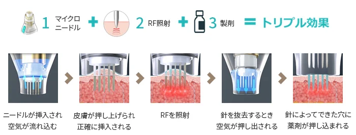 高周波(RF)とマイクロニードルを組み合わせた独自の技術によって、肌の深層へダイレクトに熱エネルギーを届け、コラーゲンの再構築やターンオーバーの促進を図ります。さらに、豊富な専用チップの中から目的に合わせた施術が可能であることから、肌質改善やエイジングケア、美白ケアなど幅広いニーズに応えることができます。